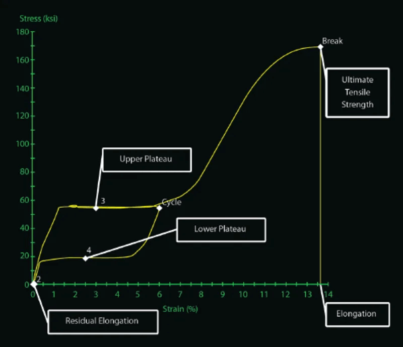大多数商业应用利用了 NiTi 合金在高于转变温度的温度下发生变形时的一种特性,即卓越的弹性,通常称为“超弹性”(superelasticity)。高于转变温度,材料处于高温或奥氏体相。当施加应力时,变形产生的应力引起金属从奥氏体到马氏体的相变。当施加的应力消除后,材料立即弹回,晶型恢复为奥氏体相。