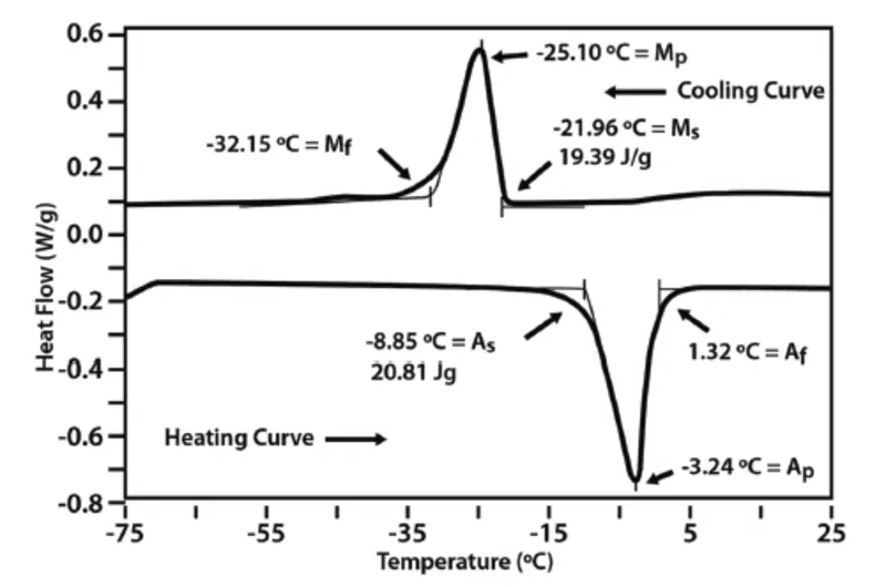 事实上,由于转变温度对合金成分的敏感性非常高,因此不推荐使用化学成分方法来指定合金,采用转变温度来指定评价合金是更准确的方法。测量金属锭转变温度最常用的方法之一是使用差示扫描量热仪(differential scanning calorimeter, DSC)。ASTM F2004是DSC测试方法的标准。DSC记录的转变信息类型如图2所示,图中标记了各种转变温度。